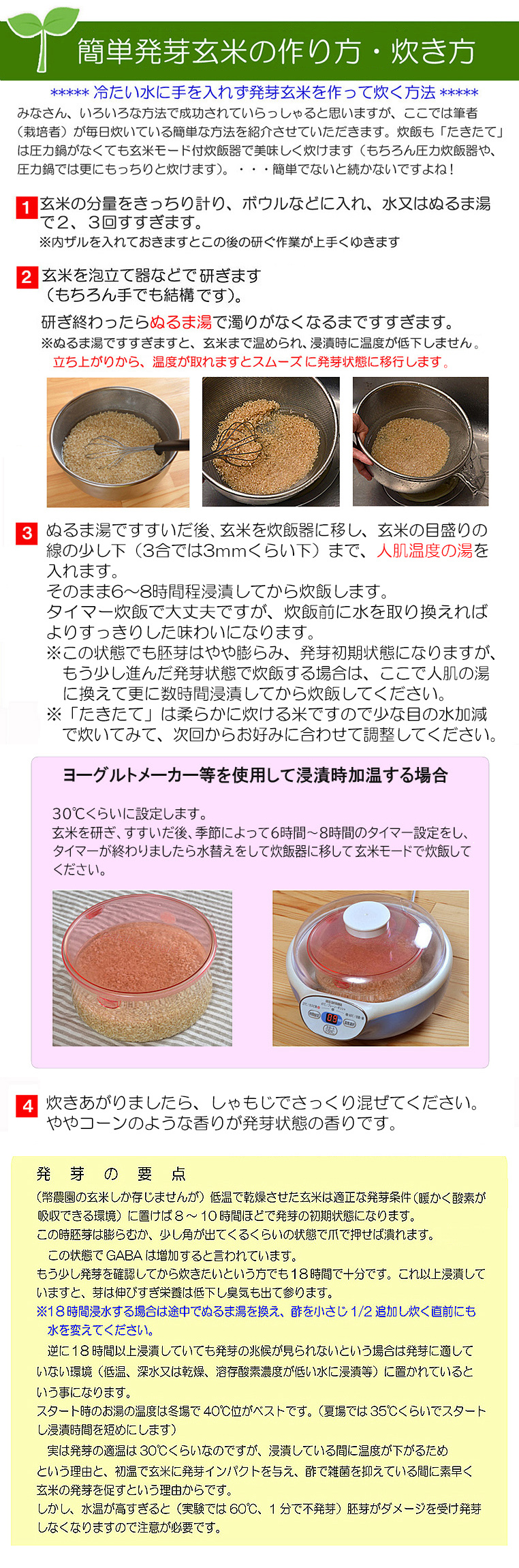 こちらに紹介しますのは低アミロース米(モチモチしたウルチ米)である「たきたて」の発芽玄米の炊き方です。「たきたて」発芽玄米は炊飯器でも柔らかく炊けますので、簡単に玄米を食べてみたいという方に便利です(高圧圧力鍋で炊きますと餅米のような炊き上がりになりますので圧力や加圧時間を調整してください)。